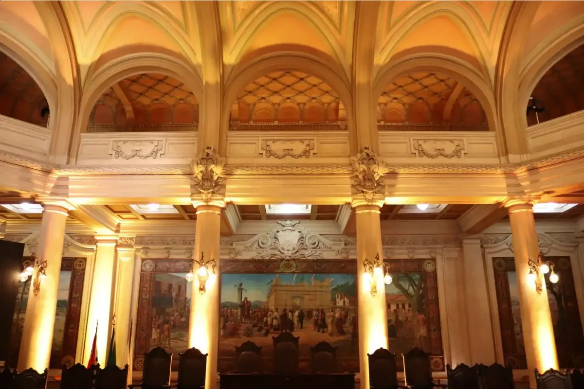 O destaque vai para as obras de Benedicto Calixto que adornam o salão, como “O Porto de Santos em 1822” e “A Fundação da Vila de Santos – 1545”.